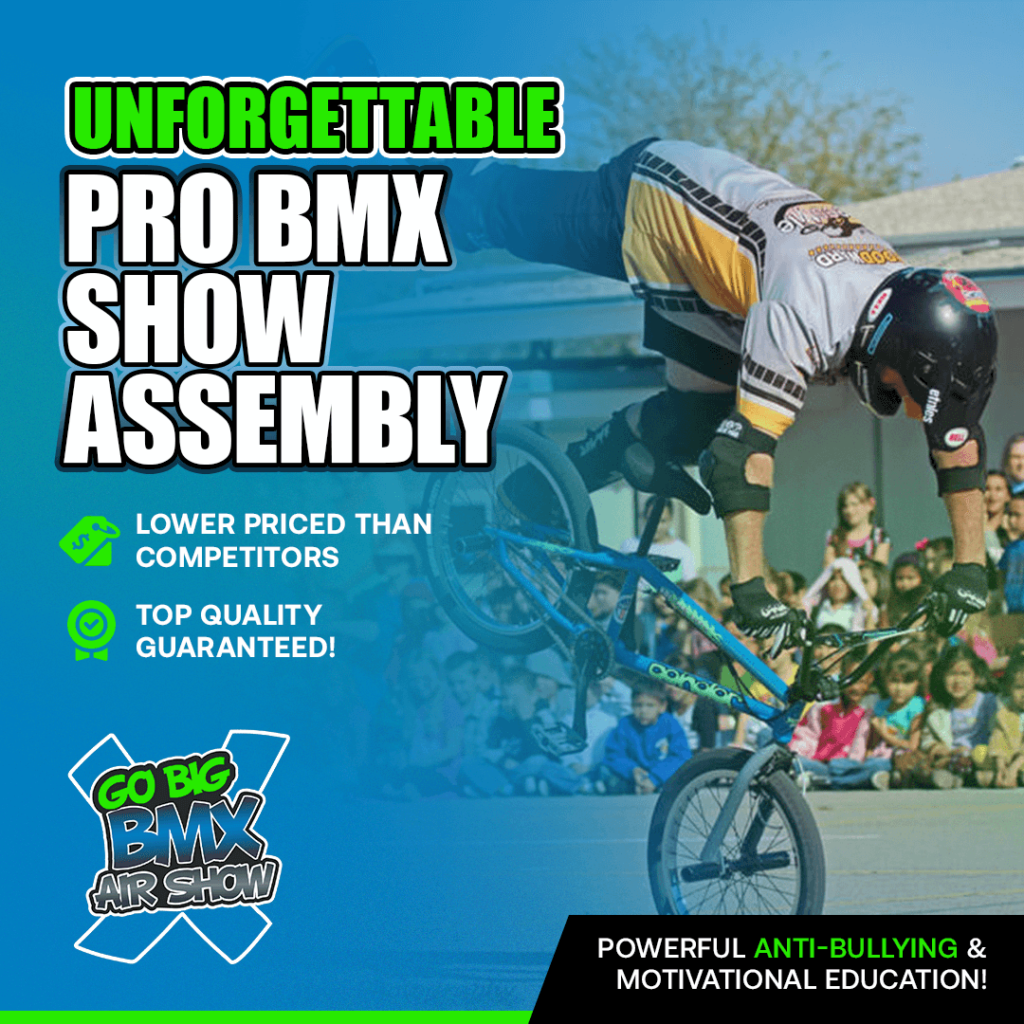 You won’t want to miss this time-tested assembly, seen in thousands of Elementary, Middle and High Schools from Hawaii to New York and everywhere in-between. Founded by school assembly veteran David W. Holden, the Go BIG BMX Air Show is an evolution of decades of experience as a motivational speaker and BMX performer. Experience, a focus on quality and authentic education and choosing athletes who truly care and exhibit positive role-model traits that you will welcome to your school is what sets us apart.