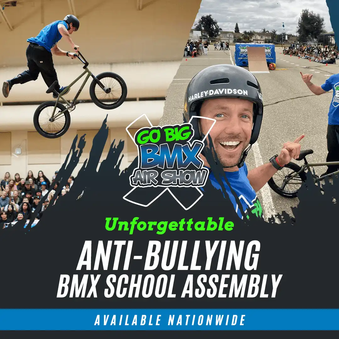 AVAILABLE NATIONWIDE! Don’t miss this exciting school assembly program, featuring some of the World’s Elite Pro BMX Athletes, in an exhilarating performance of BIG AIR Stunts and amazing flat ground stunt riding. This 40-minute assembly is a kid, and staff, favorite as the assembly will energize the kids with positive vibes, inspired minds, and motivation to think BIG, dream BIG and Go BIG in life! Utilizing the role-model athletes as powerful positive influencers is an IDEAL way to truly reach the next generation. A kid inspired can reach for the stars, and what better way to provide this inspiration than with a LIVE PRO BMX Stunt Show they will never forget. And, you can trust Go BIG BMX Air Show to deliver, it was created, developed and is managed by 30-year veteran David W. Holden who has personally performed and MC’d in over 8,000 performances since 1996. Bringing the next generation of athlete role-models to schools nationwide with an exciting assembly and powerful anti-bullying & motivation messages, it’s time to GO BIG with your next school assembly idea, BOOK this Assembly today, while tour openings are still available. Spring Tours are booking NOW!